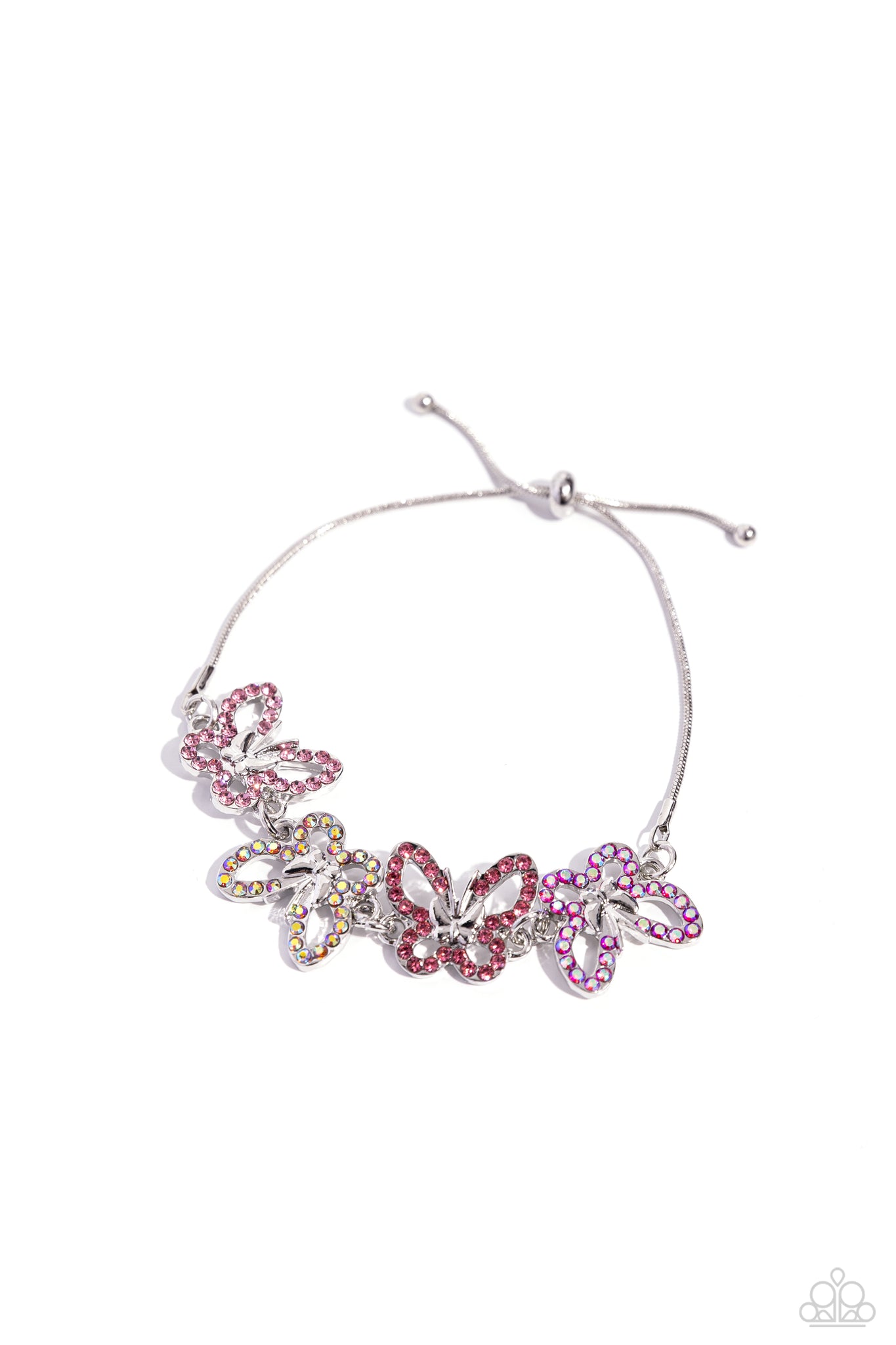 Attached to a silver snake chain, a whimsical collection of multicolored pink and iridescent-dotted silver butterflies flutter along the wrist. Features a sliding bead closure.
