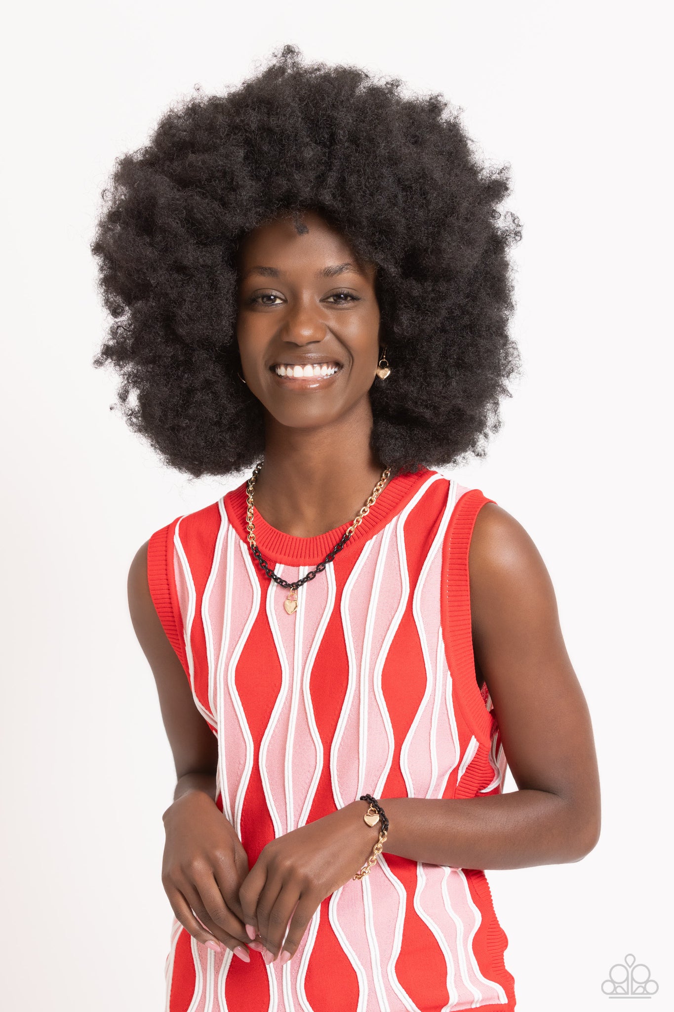 Infused with splashes of black chain, a lengthened oversized high-sheen gold chain dances down the chest for a spunky industrial statement. A dainty hammered gold lock pendant graces the bottom of the necklace, further infusing the design with a touch of romanticism. Features an adjustable clasp closure.