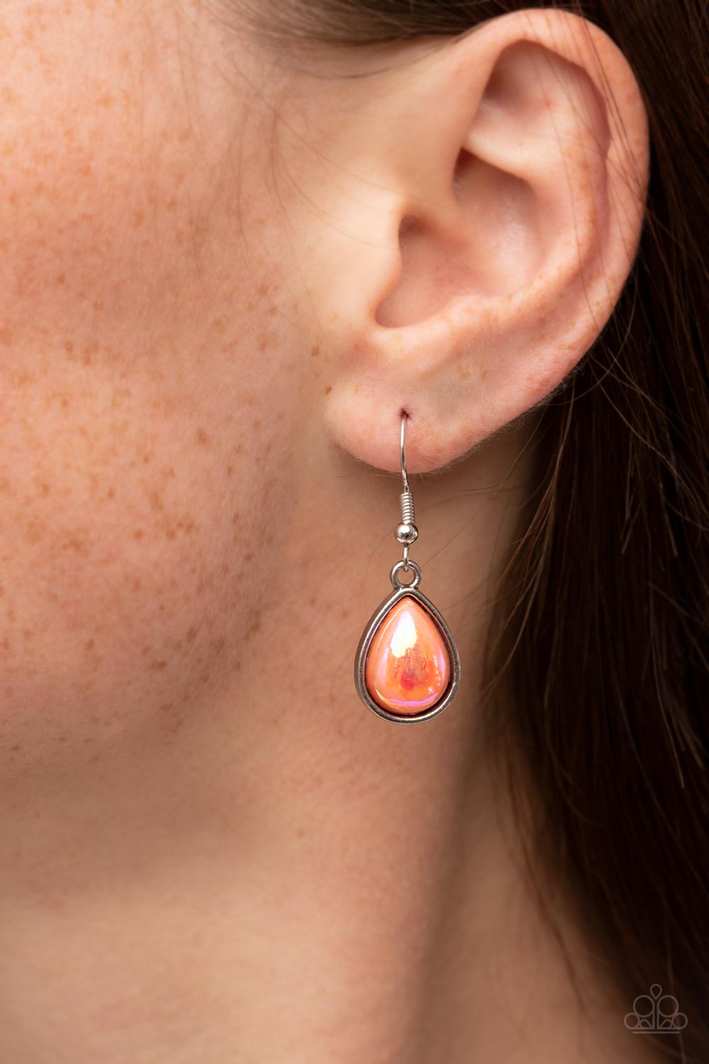 Brushed in an iridescent finish, an orange teardrop bead is pressed into the center of an oversized silver teardrop frame that is bursting with vine-like filigree. Infused with matching teardrop beaded frames, the ethereal pendant glides along the beaded silver chain for a magical finish. Features an adjustable clasp closure.