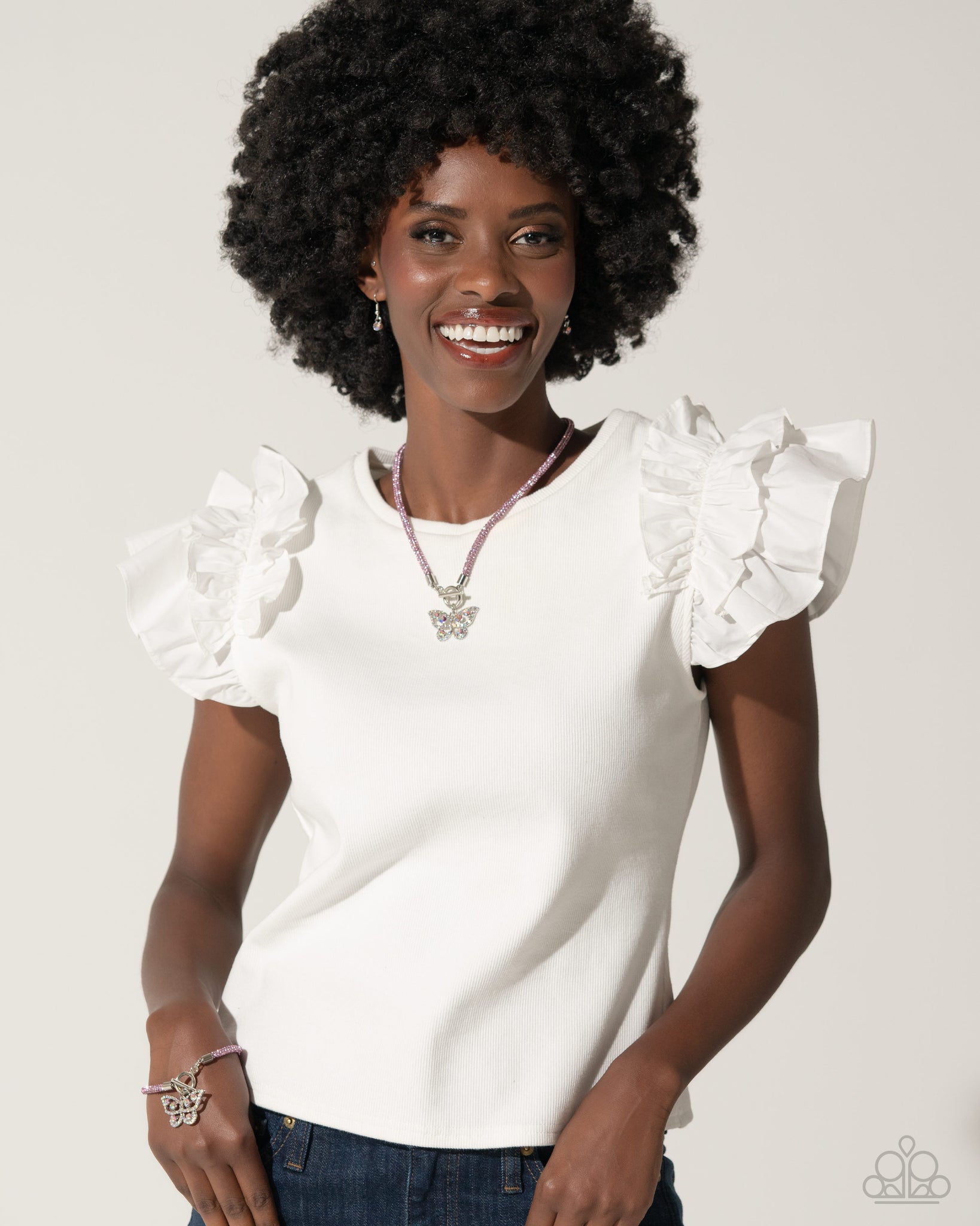 Embellished in light pink rhinestones, a mesh chain loops around the neckline, connecting through a silver toggle clasp. A light pink and iridescent-encrusted airy silver butterfly flutters below the pink chain for a whimsically light finish. Features a toggle clasp closure. Due to its prismatic palette, color may vary.